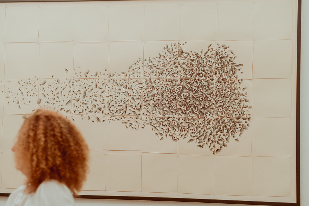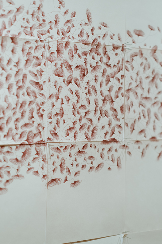 Nel disegno stesso che registra l’avvenuta trasformazione, il tempo organico della natura si fa orientamento creativo. Il disegno torna su stesso in un moto circolare, immerso nella dimensione in cui il campo visivo e quello mentale coincidono. “Ho scelto di lasciarmi condurre da questi movimenti, di abbandonare la centralità del gesto autoriale per entrare in dialogo con una dimensione più ampia, condivisa, impersonale” (Clelia Catalano).
