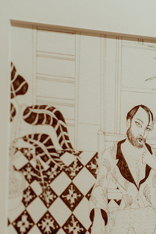 Anche gli uomini, nel rito della vestizione che precede il disegno, sono chiamati a creare una correlazione tra il divenire del pensiero e il divenire delle forme. Gli abiti di Clelia, spesso floreali, vengono fatti indossare in un vero e proprio atto performativo che prevede il trucco e uno shooting gender-bender. Gli amici di Clelia entrano così nella figurabilità infinita delle piante che li circondano. Sottratti al divenire cui sono tenuti per la loro configurazione maschile, gli amici di Clelia, indossando il travestimento femmineo e terrestre, hanno solo da essere e mostrarsi. (4)